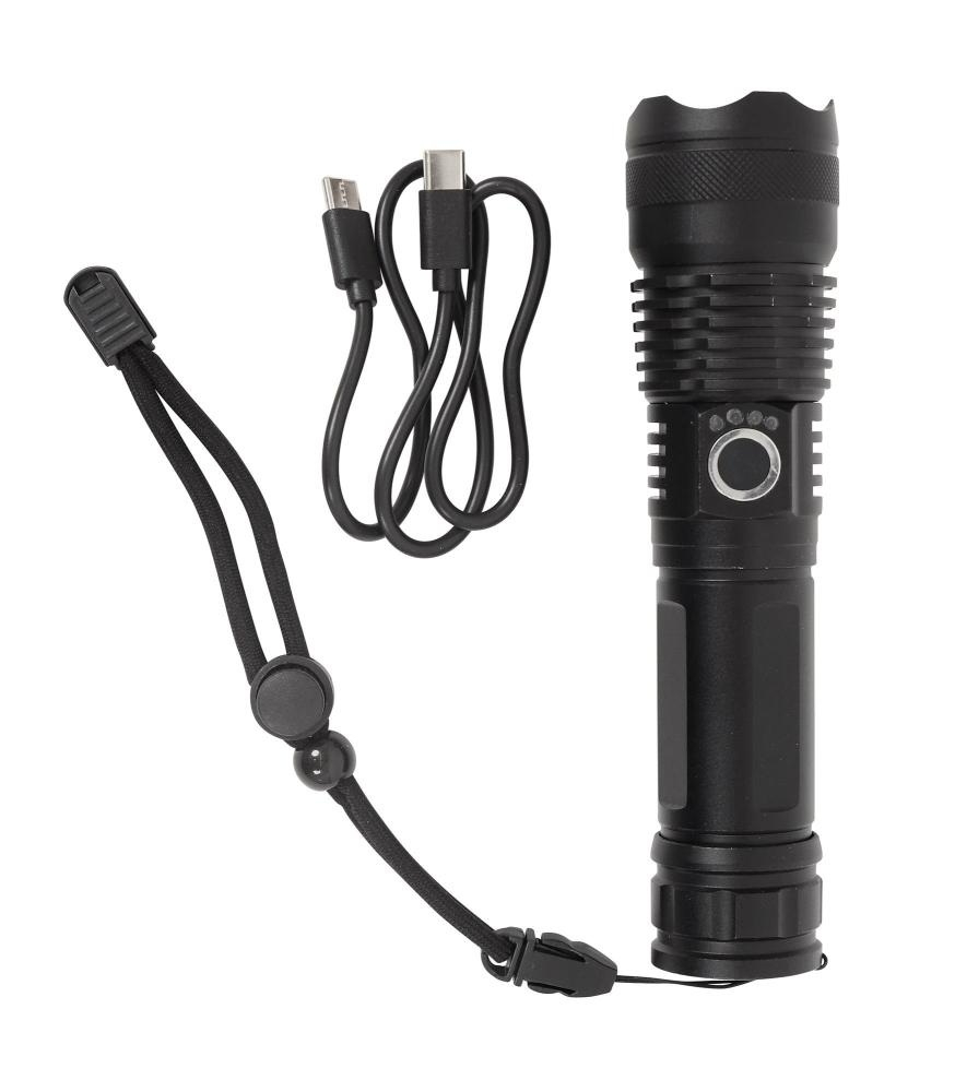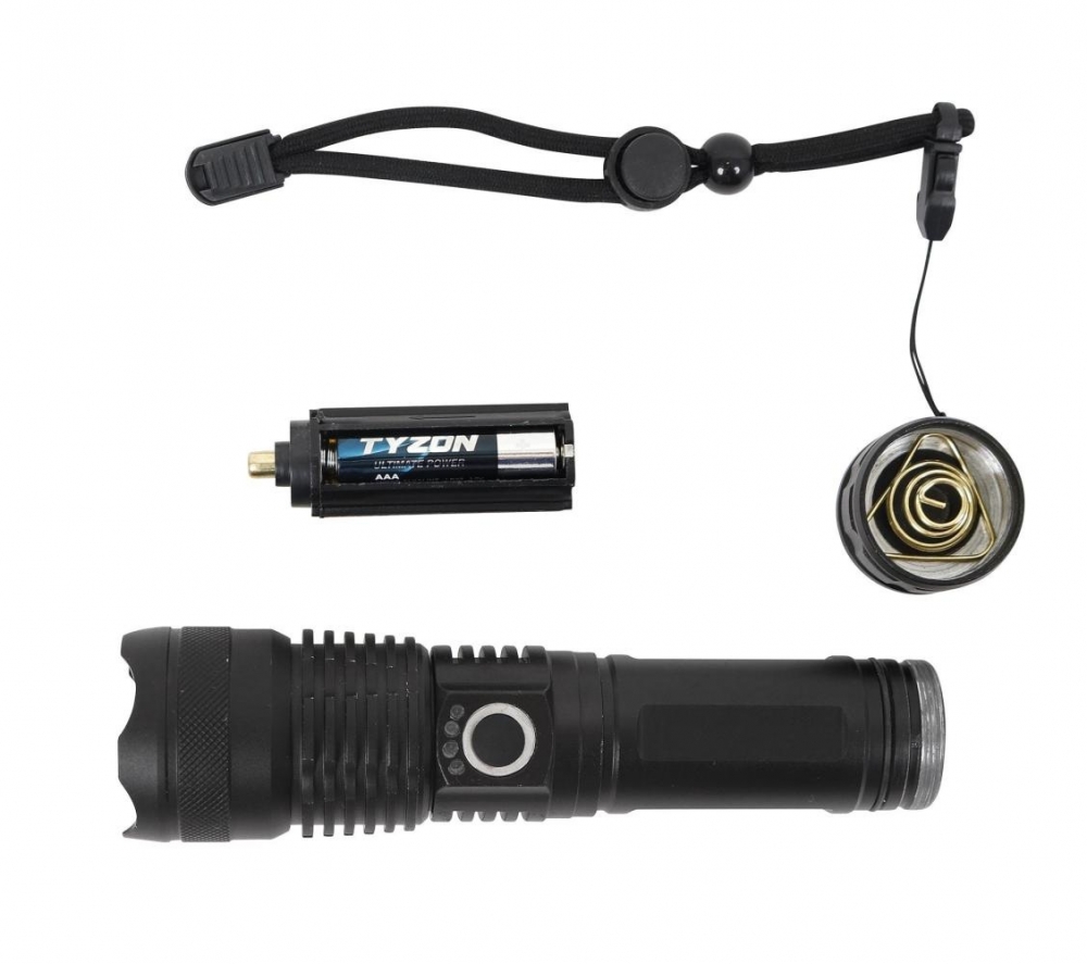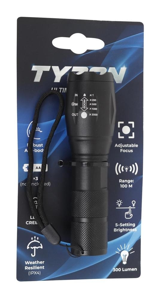 Tyzon lommelykt i aluminiumlegering med justerbart fokus og 5 funksjoner: sterkt/normalt/svakt lys, blinking og SOS. Bruk den med 3xAAA batterier (ikke inkl) eller det medfølgende oppladbare batteriet som lades med ladekabelen som følger med.