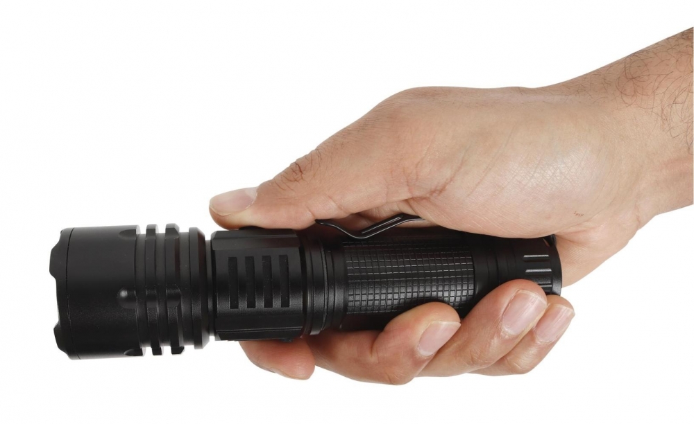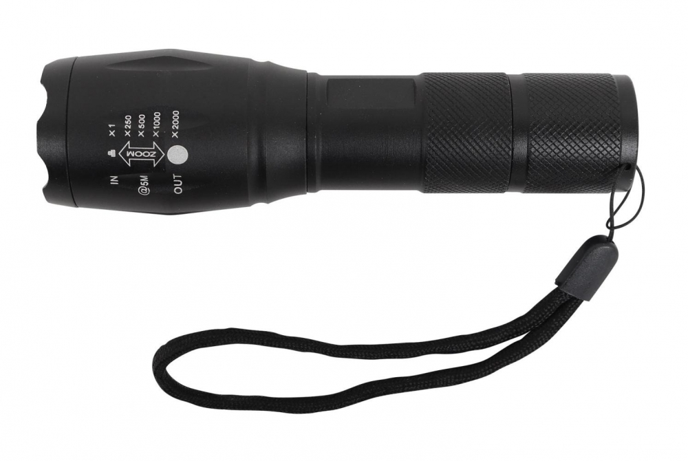 Tyzon lommelykt i aluminiumlegering med justerbart fokus og 5 funksjoner: sterkt/normalt/svakt lys, blinking og SOS.