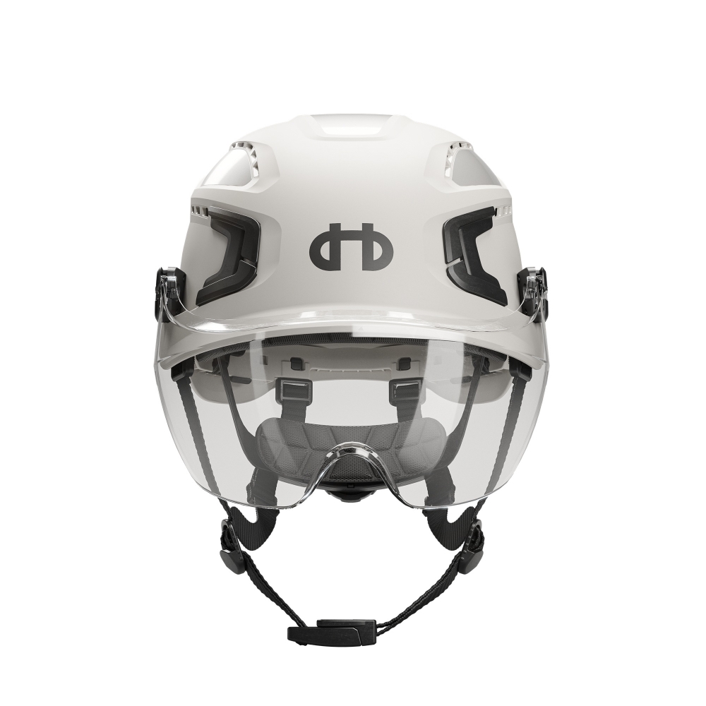 Kort visir som beskytter øynene mot slag og flygende partikler. Leveres med fester som enkelt monteres på hjelmen.