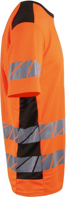 Pro-dry behandlet high-vis unisex t-skjorte med elastiske heat transferreflekser rundt midje og ermer. Kontrastfelt i sort på hals og sidepanel. CE-merket EN 20471, klasse 2.
