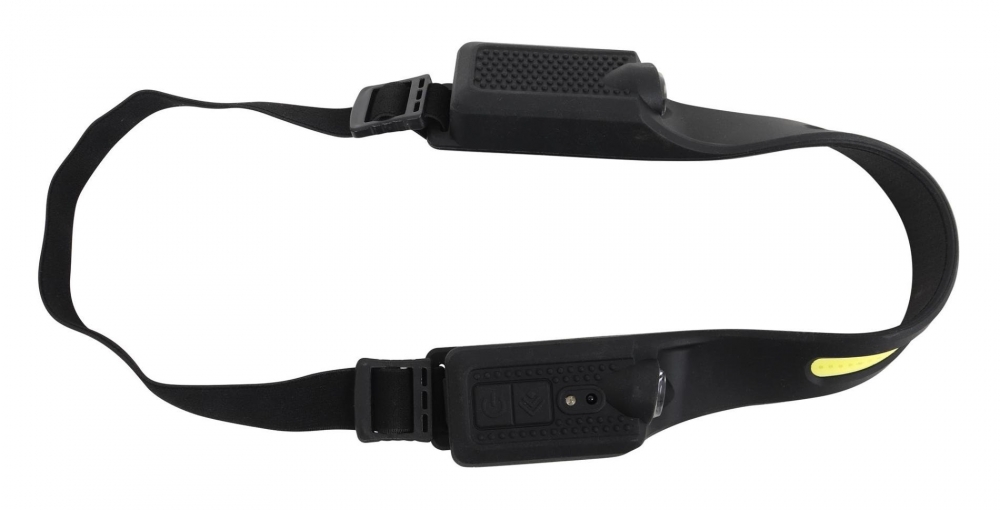 Oppladbar LED-hodelykt i silikon med LED-lysstripe, 2 sidelykter til spotlys og håndstyrt sensor for tenning og slukking av lyset.