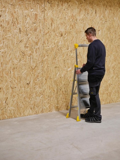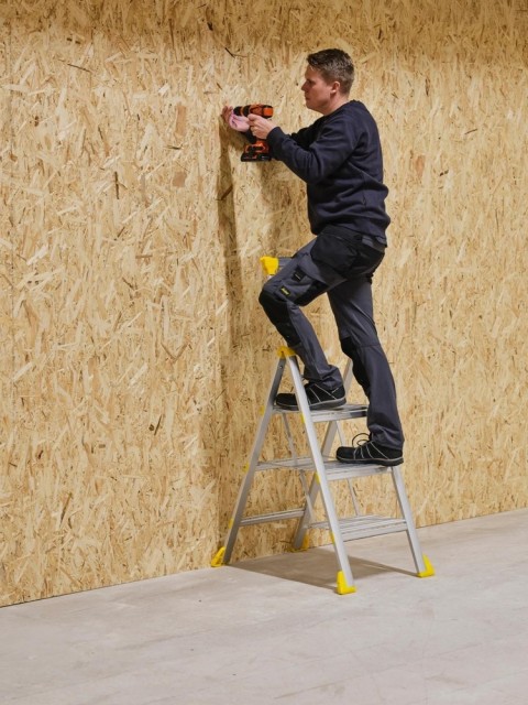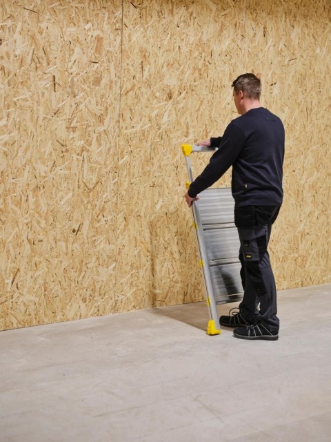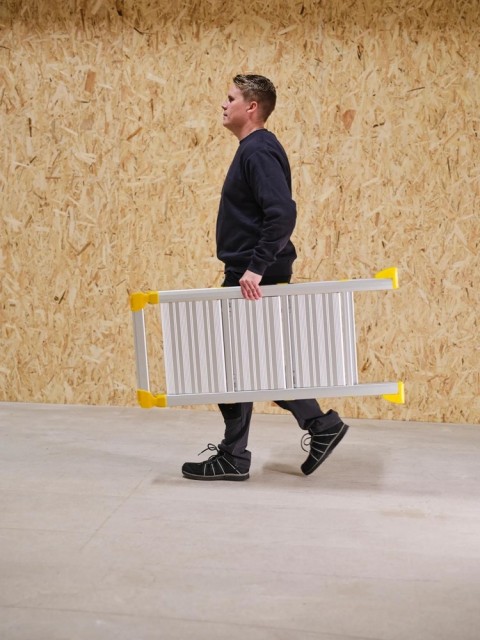 Den slankeste arbeidsbukken for proffbruk. Vikingstep Pro R er en arbeidsbukk med ekstremt kompakt design – kun 45–55 mm tykk når den er sammenfoldet. Den kombinerer stabiliteten til en arbeidsbukk med det kompakte, mobile designet du kjenner fra en liten gardintrapp, og er utviklet for profesjonelle som trenger en trygg og plassbesparende løsning. Dette er den perfekte proffstigen for vaktmestere, elektrikere, serviceteknikere og håndverkere som er mye i bevegelse i løpet av arbeidsdagen. Den lette og slanke aluminiumskonstruksjonen gjør den enkel å bære i trapper, gjennom døråpninger og andre trange passasjer. Den kompakte og plassbesparende utformingen gjør det også enkelt å oppbevare stigen i alle typer kjøretøy. Håndlisten og de dype trinnene gir tryggere klatring og bedre balanse, slik at du kan jobbe mer effektivt. Rekkverket kan skyves ned for enkel transport og lagring, og har i tillegg en holder for el-verktøy. Bruk sporet på toppen til små verktøy og skruer mens du jobber. Godkjent i henhold til europeisk standard EN131, Arbeidstilsynets forskrifter for stiger og arbeidsbukker, samt den svenske merkingen for sikrere stigeprodukter «Bra Arbetsmiljöval».