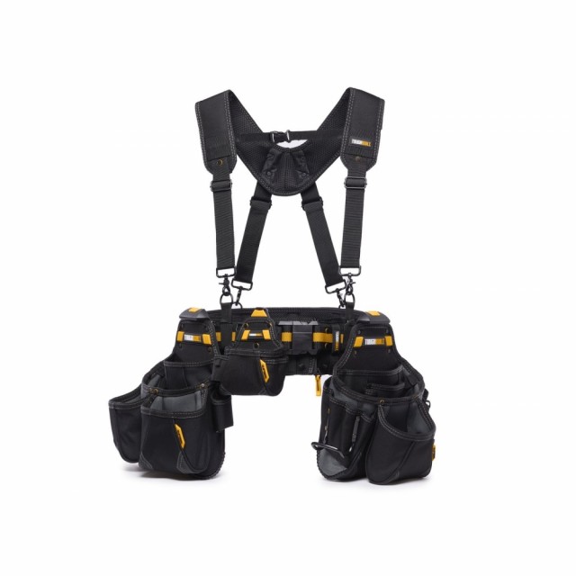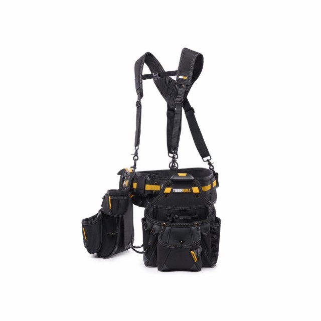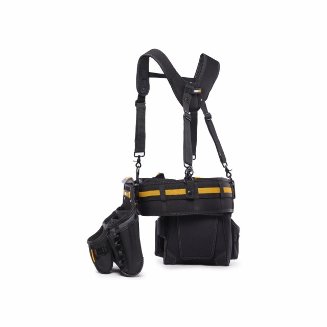 Hver slitesterke veske har en integrert støtte som lar vesken stå av seg selv på gulv, bord eller nesten alle flate overflater. For langvarig komfort og støtte inkluderer 5-delers Pro Contractor Rig Set et polstret belte med kraftig spenne og polstrede seler, 36 tilpassede lommer og løkker, inkludert 6 lommer med stor kapasitet konstruert med No-Snag Hidden-Seam-design. Det er også en lomme til notatbok, en lomme til hurtig firkant, en separat lomme til målebånd, en ekstremt slitesterk hammerløkke og 2 målebåndklips. 6-lags konstruksjon og sterk nagleforsterkning gir dette verktøybeltet den tøffheten og holdbarheten som trengs for å tåle de tøffeste arbeidsforholdene.
