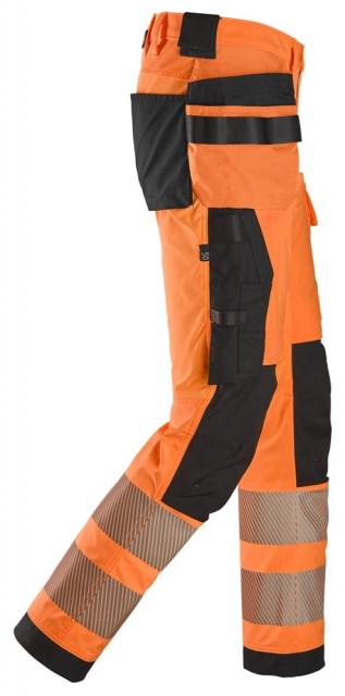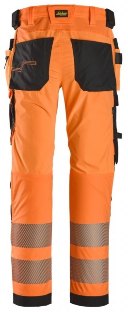 Denne synlighetsbuksen med smal passform og hylsterlommer er utviklet for fagfolk som jobber med bygging, taktekking, transport og lignende. Buksen er laget av fasongsydd materiale med full stretch. Den har vindtette områder og områder for ventilasjon for å sikre beskyttelse når det blåser, og bevegelsesfrihet for lange dager utendørs. CORDURA®-forsterkede knær og formsydde ben gir behagelig passform, og forsterkede benavslutninger forbedrer slitestyrken og bidrar til å holde fuktigheten ute. Buksen har også hylsterlommer med verktøyhemper, samt KneeGuard™-systemet for knebeskyttelse, i henhold til EN 14404. I tillegg har den en CORDURA®-forsterket tommestokklomme med penn- og knivrom, en lårlomme med ID-kortholder samt verktøyholdere med borrelås. Buksen er sertifisert i henhold til EN ISO 20471 klasse 2, og den er perfekt for miljøer med lite lys takket være segmenterte trykte reflekser rundt bena for ekstra synlighet.