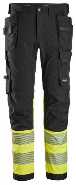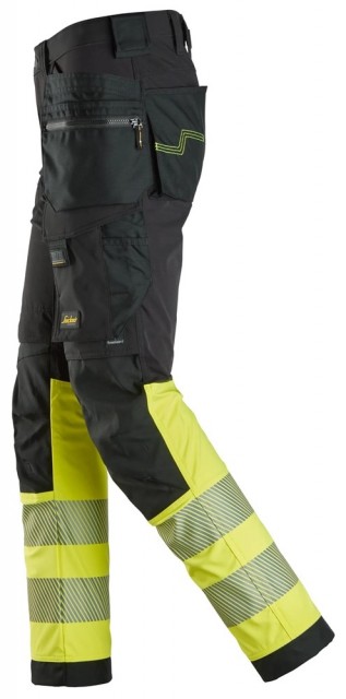 Denne buksen med smal passform er utviklet for fagfolk som jobber med bygging, taktekking, logistikk og lignende. For praktisk oppbevaring har den CORDURA®-forsterkede hylsterlommer med meshhemper. Den har kroppstilpasset materiale i full stretch som kombinerer vindtette partier med ventilerte partier for å gi beskyttelse mot vind, samt god bevegelsesfrihet. CORDURA®-forsterkninger på knærne og tommestokklommen sørger for slitestyrke, og forhåndsbøyde ben og stretchpaneler gir en fleksibel og komfortabel passform. Denne buksen er sertifisert i henhold til EN ISO 20471 klasse 1 for synlighet, og EN 14404 for knebeskyttelse, og den gir beskyttelse i miljøer med lite lys. Andre funksjoner inkluderer verktøyholdere med borrelås, segmenterte trykte reflekser rund bena, en lårlomme med ID-kortholder samt påsydde baklommer.