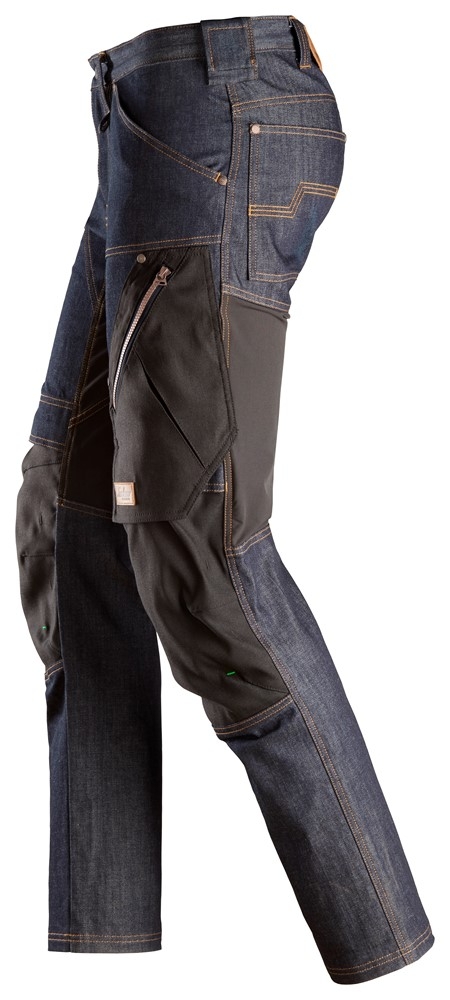 Fleksibel arbeidsbukse i denim med smal passform, utviklet for krevende arbeidsforhold. Slitesterkt denim-materiale kombinert med kroppstilpassede stretchpaneler sikrer slitestyrke og bevegelsesfrihet, og knebeskyttere som er sertifisert i henhold til EN 14404 sikrer pålitelig beskyttelse. I tillegg har arbeidsbuksen verktøyholdere og lårlommer med rom med glidelås.