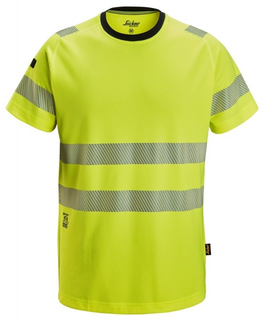 Allsidig high-vis t-skjorte i dobbeltvevd materiale med myk bomull på innsiden og slitesterk polyester samt varmeforseglet segmentert refleksbånd på utsiden. Resultatet er et slitesterkt, men likevel behagelig plagg med synlighet i klasse 2, godkjent i henhold til EN ISO 20471. I tillegg har t-skjorten raglanermer for økt bevegelsesfrihet.